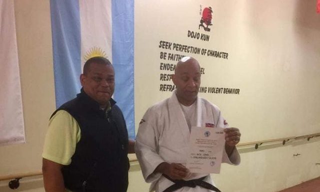Nick LOWE al momento de recibir su Graduación de Sexto Dan de manos del profesor Julian Abreu Jiménez presidente Asojudousa en representación de la Unión Panamericana de Judo (UPJ)